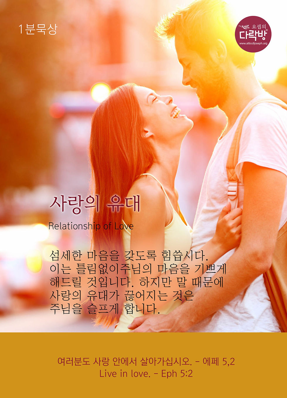 [1분묵상] 사랑의 유대권요셉Mar 9, 20171 min read 사랑의 유대 (Relationship of Love) 섬세한 마음을 갖도록 힘씁시다. 이는 틀림없이 주님의 마음을 기쁘게 해드릴 것입니 다. 하지만 말 때문에 사랑의 유대가 끊어지는 것은 주님을 슬프게 합니다. [말씀] 여러분도 사랑 안에서 살아가십시오. - 에페 5,2[DW] Live in love. - Eph 5:2