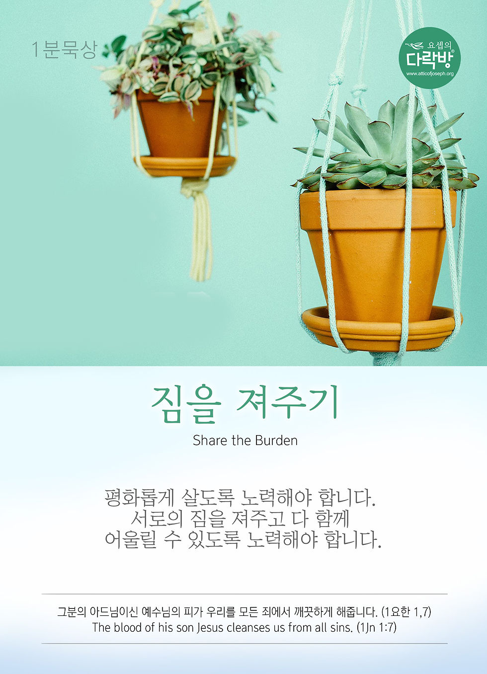 [1분묵상] 짐을 져주기권요셉Sep 8, 20171 min read 짐을 져주기 (Share the Burden) 평화롭게 살도록 노력해야 합니다. 서로의 짐을 져주고 다 함께 어울릴 수 있도록 노력해야 합니다. [말씀] 그분의 아드님이신 예수님의 피가 우리를 모든 죄에서 깨끗하게 해줍니다. (1요한 1,7)[DW] The blood of his son Jesus cleanses us from all sins. (1Jn 1:7)